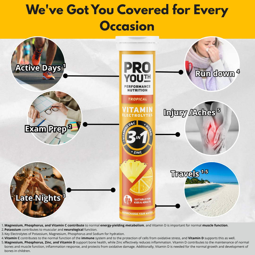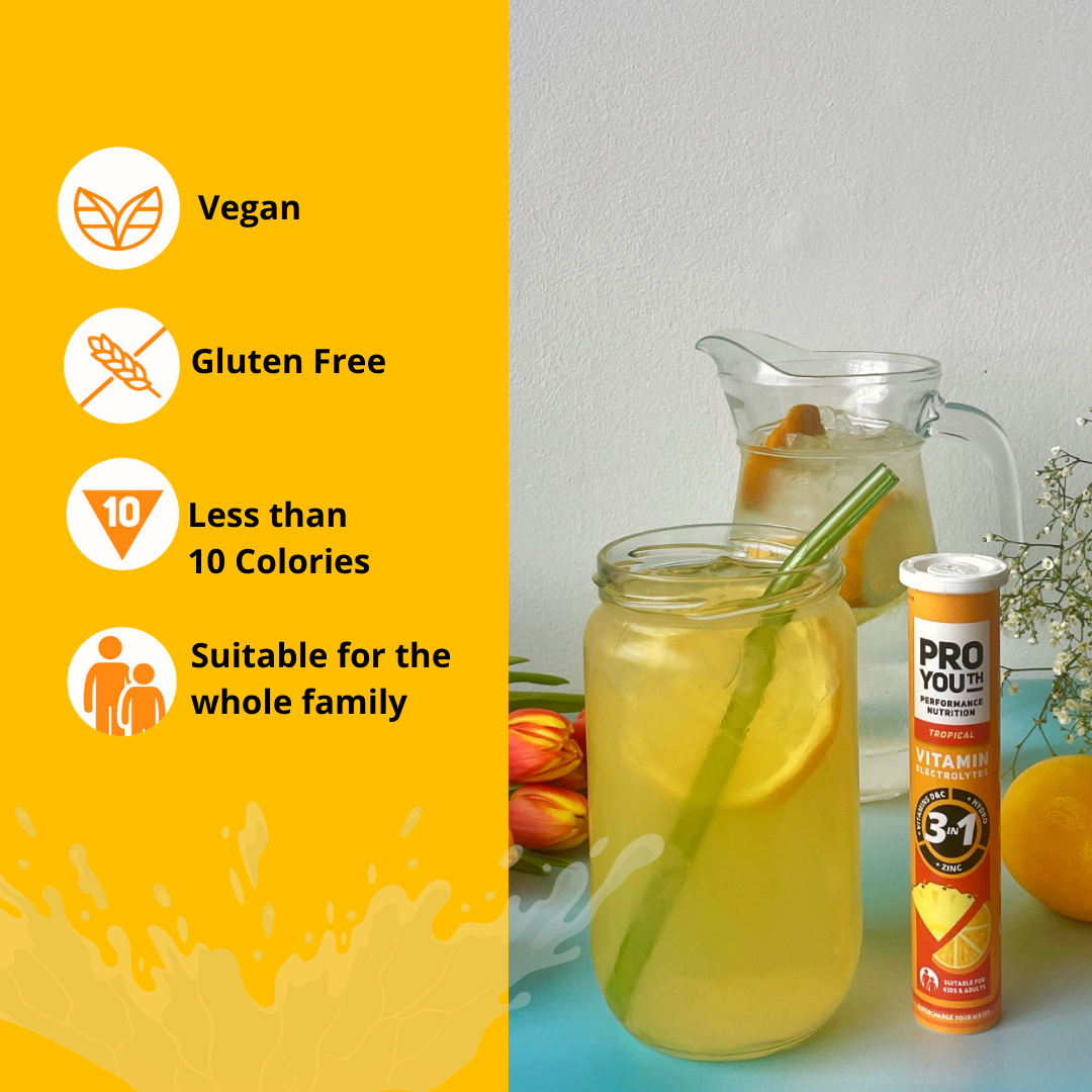 Our Tropical Electrolytes are fizzing with orange and pineapple flavour suitable for both adults and kids. It is a tasty and convenient way to provide instant hydration, optimise recovery and bodily functions. With its added Immune protecting Vitamins, it not only keeps your immune health in check whilst keeping body replenished.