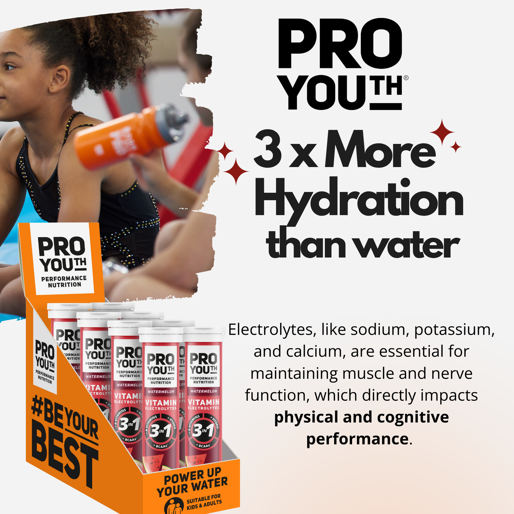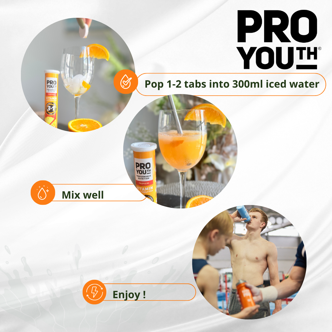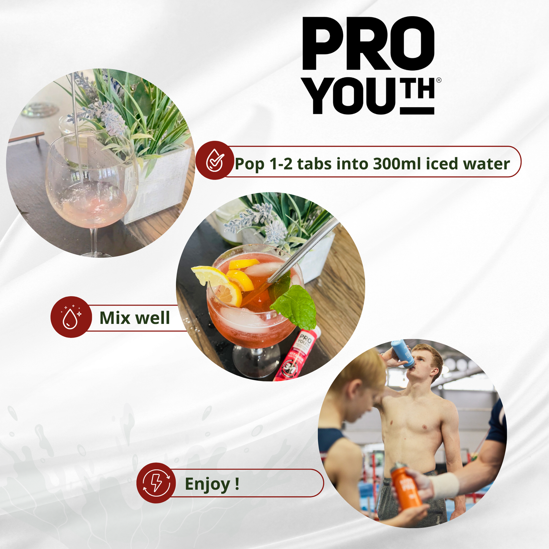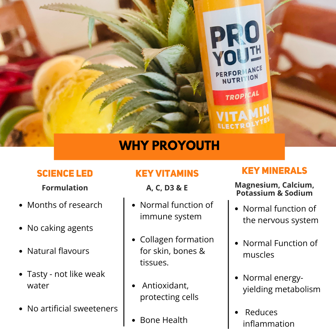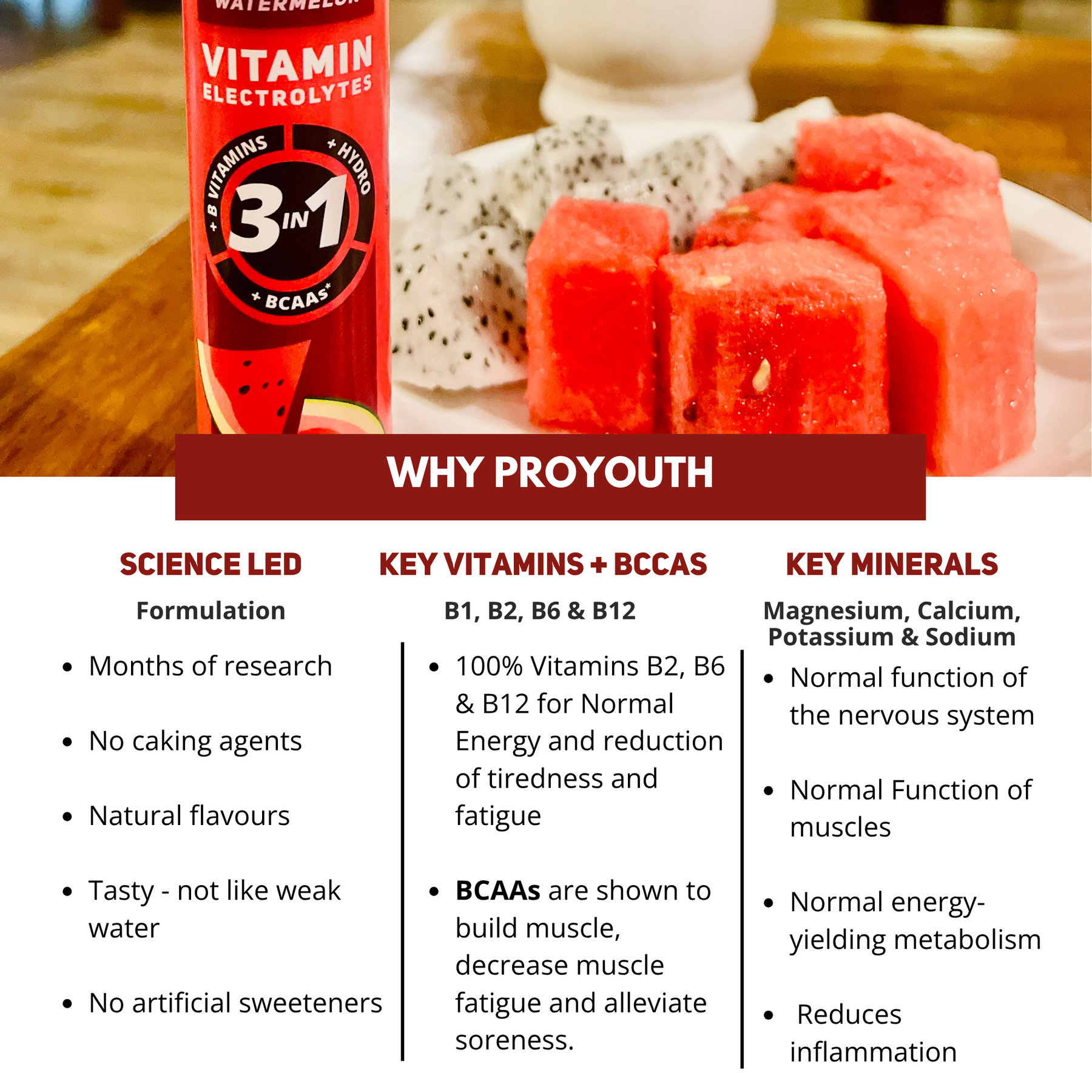 ProYouth Vitamin Electrolytes is a science lead, formula made to suit both adults and kids to support effective hydration, optimise performance. Added BCAAs to build muscle synthesis, protect cells from inflammation and oxidative damage, and support healthy immune system.